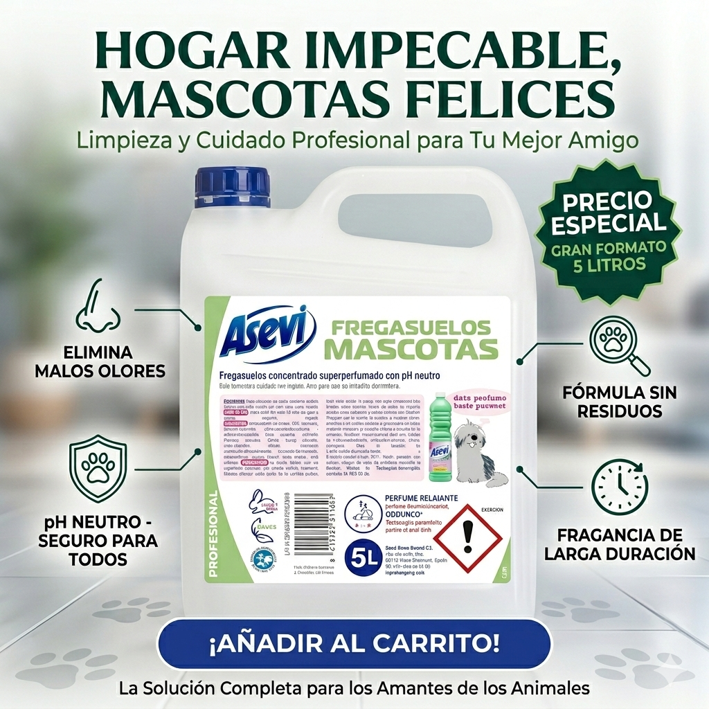 Transforma la higiene de tu hogar con una fórmula diseñada específicamente para convivir con tus mejores amigos. El Fregasuelos Asevi Mascotas no solo limpia; cuida la salud de tus animales y crea un ambiente de máxima frescura. ✨