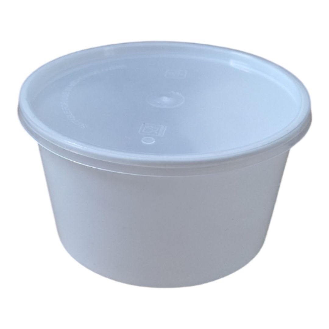 Tarrina pp redonda blanca de 1000 cc ideal para comida caliente ya que es apta para introducir en el microondas, pack de 50 unidades en caja de 3 pack, lleva sus tapas incluidas.