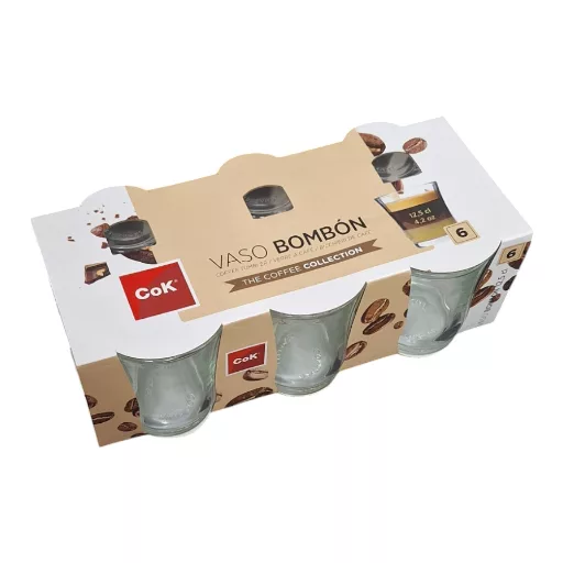 Vaso carajillo bombón de cristal con una capacidad de 12,5 cl presentado en caja de 6 unidades, ideal para café bombón o carajillo